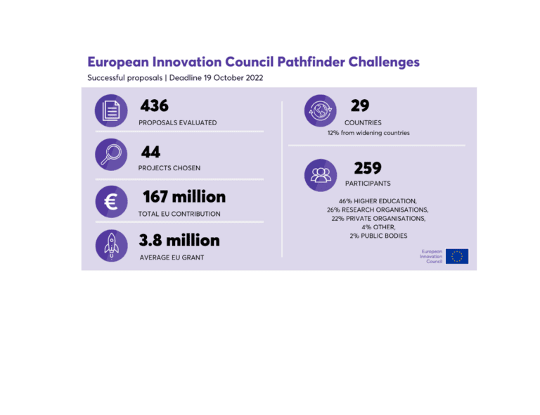 With a total budget worth €167 million, the EIC (European Innovation Council) has selected 44 new projects from 436 evaluated proposals under the October 2022 EIC Pathfinder call:: Each