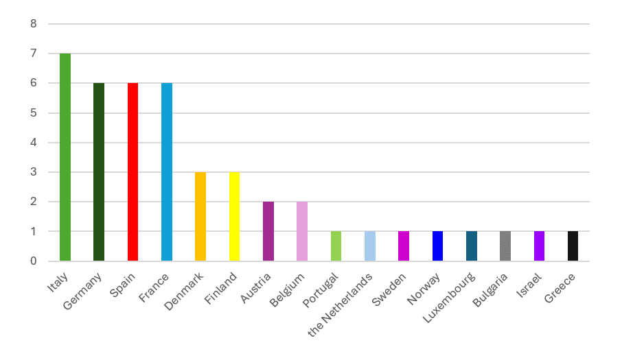 Participants from 30 countries are involved in the awarded projects, showing a strong international profile of consortia. The top 3 countries with regard to the number of awarded proposals are Italy (16%), Spain, Germany and France (14% each):