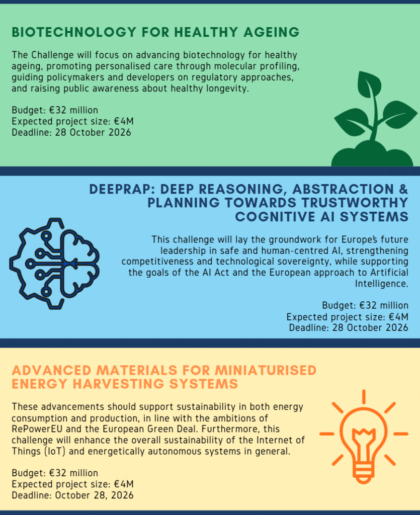 - Three new topics for EIC Pathfinder challenges: Biotechnology for Healthy Ageing, DeepRAP: Deep Reasoning, Abstraction & Planning towards trustworthy Cognitive AI Systems, and Advanced Materials for Miniaturised Energy Harvesting Systems.