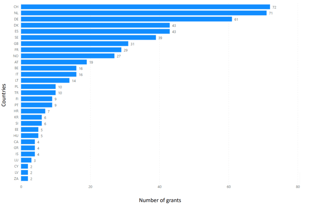 With a total EU contribution worth more than €360M, 258 projects have received funding in this period of time. The geographic focus of the awardees spreads across 31 countries, most of them located in Switzerland (72 projects, 27.9%), the Netherlands (71 projects, 27.51%), Germany (61 projects, 23.64%), Denmark (43 projects, 16.6%), and Spain (43 projects, 16.6%). All grants include at least 2 participating countries.
