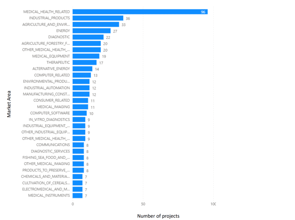 When looking at markets, the main areas are medical health related (96 projects, 37.20%), industrial products (36 projects, 13.95%), agriculture & environment (33 projects, 12.79%), energy (27 projects, 10.46%) and diagnostic (22 projects, 8.52%). Projects can be assigned to more than one market area in the database.