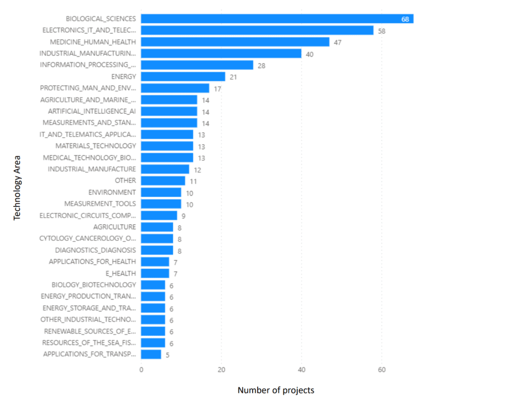 Regarding the technology area, most of the awarded projects belonged to the field of biological sciences (68 projects, 26.35%), followed by electronics IT & telecommunication (58 projects, 22.48%), and medicine human health (47 projects, 18.21%). Eurostars projects could be assigned to more than one technology area in the database.